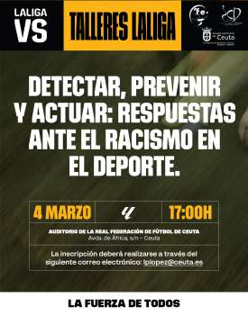 La Ciudad Autónoma de Ceuta, a través del Instituto Ceutí de Deportes (ICD) y de la Consejería de Comercio, Turismo, Empleo y Deporte, en colaboración con LaLiga, celebrará el próximo 4 de marzo de 2026, a las 17:00 horas, el taller formativo “Detectar, prevenir y actuar: respuestas ante el racismo en el deporte”.