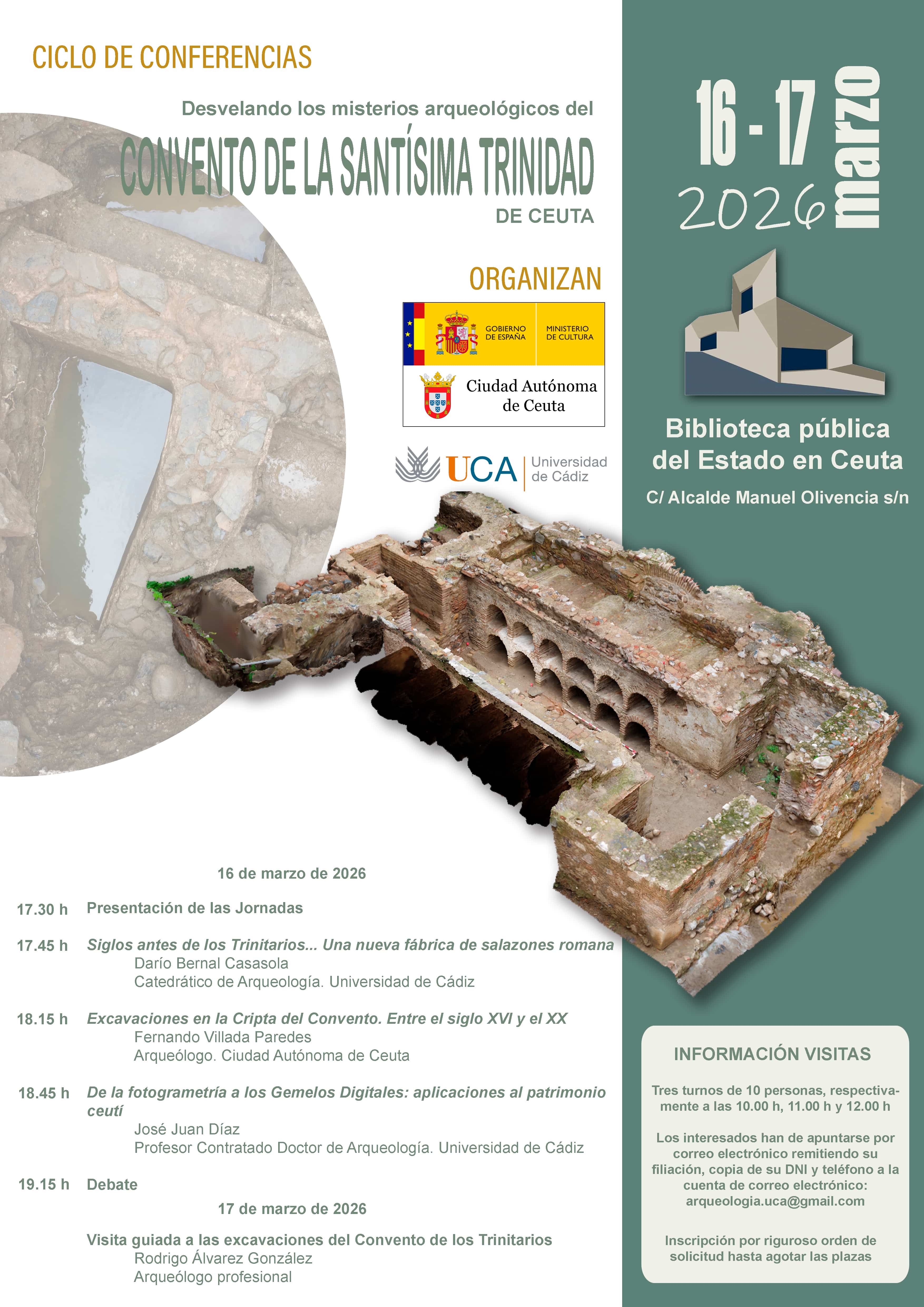 El programa incluirá tres conferencias y varias visitas guiadas a la excavación, en las que participarán investigadores implicados en los trabajos arqueológicos y en las que se presentará un avance de los resultados obtenidos hasta el momento. La jornada comenzará a las 17.30 horas con la intervención del catedrático Darío Bernal Casasola, que abordará el pasado más antiguo del lugar con la conferencia “Siglos antes de los Trinitarios… Una nueva fábrica de salazones romana”, centrada en los hallazgos que evidencian la actividad industrial romana previa a la fundación del convento. Posteriormente, el arqueólogo Fernando Villada Paredes presentará los resultados de las excavaciones en la cripta del convento, que abarcan desde el siglo XVI hasta el XX. La sesión continuará con la intervención del profesor José Juan Díaz, quien explicará las aplicaciones de la fotogrametría y los gemelos digitales en el estudio y conservación del patrimonio arqueológico ceutí.