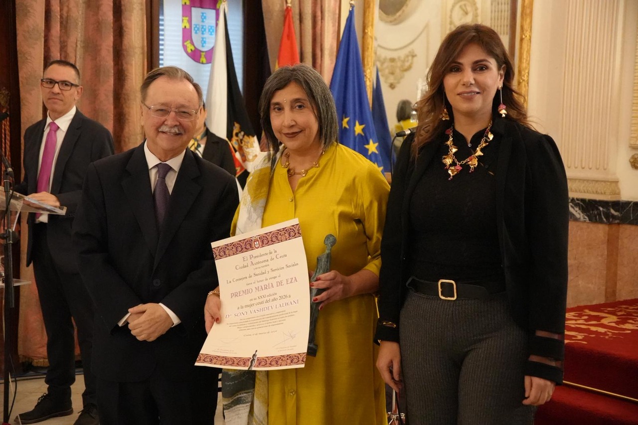 El presidente de la Ciudad, Juan Vivas, y la consejera de Sanidad y Servicios Sociales, Nabila Benzina, han entregado a la empresaria ceutí Sony Vashdev el Premio María de Eza a la mujer del año, en un acto que se ha celebrado en el Salón del Trono del Palacio de la Asamblea con la presencia de las principales autoridades civiles y militares de la ciudad.
